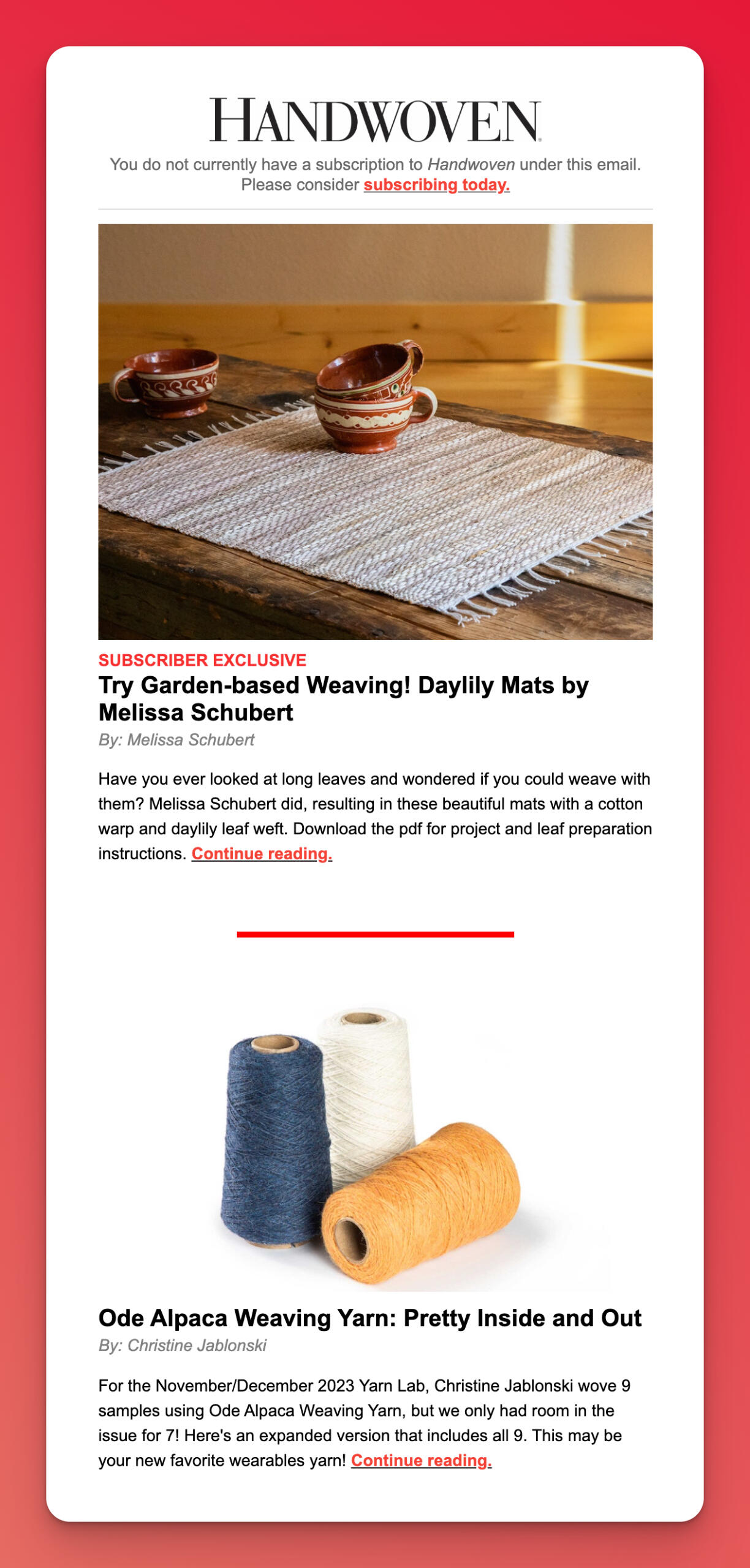 Get our weekly newsletter and stay up to date on the latest weaving content, resources, and special releases plus exclusive offers from Handwoven and our partners. In just a few minutes a week, you can connect with the handweaving world, for free.